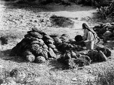 MANURE CAKES are the poor man's fuel of India. The dung of the animals is scraped up by women and children, formed into cakes and dried in the sun. Usually this is work for the Untouchables or "depressed classes," descendants of India's ancient Dravidians not taken into the caste system. Whole villages make a business of making and selling dung cakes.