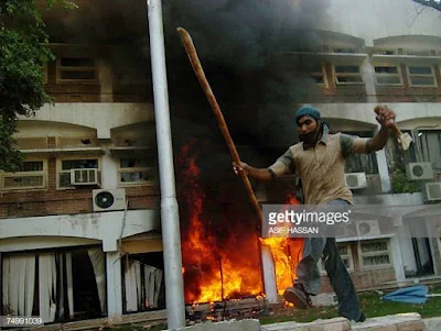 A Pakistani radical students from the Red Mosque holds a molotov cocktail as he runs after setting fire to a government building in Islamabad, 03 July 2007