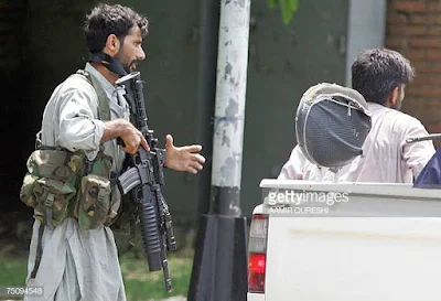 PAKISTAN - JULY 03: A masked student of Lal Masjid, or red mosque, brandishes an assault rifle from a sand-bag bunker in Islamabad, Pakistan, on Tuesday, July 3, 2007. A Pakistani paramilitary officer was among three people killed in gunfire exchanged between police and students of the Red Mosque in Islamabad today, three months after the chief cleric said he wanted to impose Islamic law in the capital. A Pakistani man weeps as he listens to a sermon by Red Mosque chief cleric Maulana Abdul Aziz (not seen) during Friday prayers in Islamabad on July 10, 2009, the second anniversary of a military assault on the mosque. Government forces surrounded the mosque on July 3, 2007 following a clash between police and Al-Qaeda-linked militants who had been using it as a base for an Islamic vigilante campaign in Islamabad. On July 10, 2007, army commandos stormed the building and an adjacent girls' school, an action that left more than 100 people dead. The mosque operation unleashed a wave of revenge bombings across Pakistan that have since killed around 2,000 people. Attacks are now part of daily life. AFP