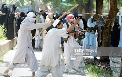 Quetta, PAKISTAN: Pakistani students of a madrassa (religious school) chant anti-government slogans as they hold sticks during a protest in Quetta, 05 July 2007, to denounce action against the radical Lal Masjid or Red Mosque in Islamabad. Abdul Rashid Ghazi, the deputy leader of the besieged Red Mosque offered to surrender if he can stay on the premises temporarily with his sick mother -- but the government said he must give up unconditionally. Ghazi said he was willing to hand over the mosque and its affiliated Islamic schools to a government department for religious buildings. AFP PHOTO/Banaras KHAN (Photo credit should read BANARAS KHAN/AFP/Getty Images)