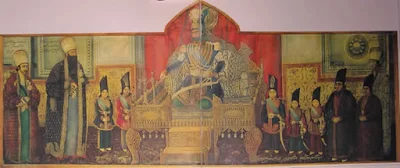 Mullahs in the royal presence. The painting style is distinctly Qajar.