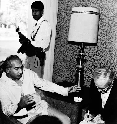 The United Democratic Front leader meeting along with PPP dissident Ahmed Raza Kasuri against the Bhutto government, 1973Z A Bhutto acknowledges the crowds in the Lahore High Court during his farcical trial, 1977