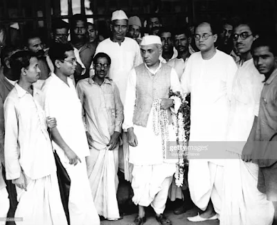Subhash-Chandra-Bose-(center)-returning-from-exile,-pictured-with-Vijaya-Lakshmi-Pandit-(left)-and-Jawaharlal-Nehru's-sister-(far-right)-upon-arrival-in-Calcutta,-India