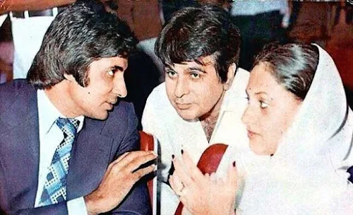Amitabh Bachchan, Dilip Kumar, and Jaya Bachchan caught during a candid chat.
