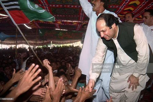 Picture taken on October 7, 1990 at Muzaffargarh showing the leader of the Islamic Democratic Alliance (IJI) party Nawaz Sharif greeting his supporters during a meeting as part of the political campaign. (Photo by Diego ZAPATA / AFP) (Photo by DIEGO ZAPATA/AFP via Getty Images)