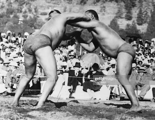 15-1935 Gunga and Sohan Singh wrestling in front of the Viceroy of India and Lady Chetwood, (seen behind), at the Punjab Mela, a religious festival held at Annandale.